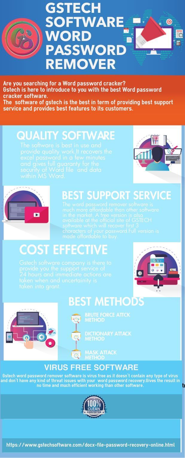 Its too easy task to recover docx file password with the assistance of GSTECH word password remover tool. With this tremendous password recovery software user can simple understand how to remove docx file password. Moreover this software perfectly work for all types of word supported version upto 2019. it really virus free software and never harm your internal stored data while recovering your exact password.