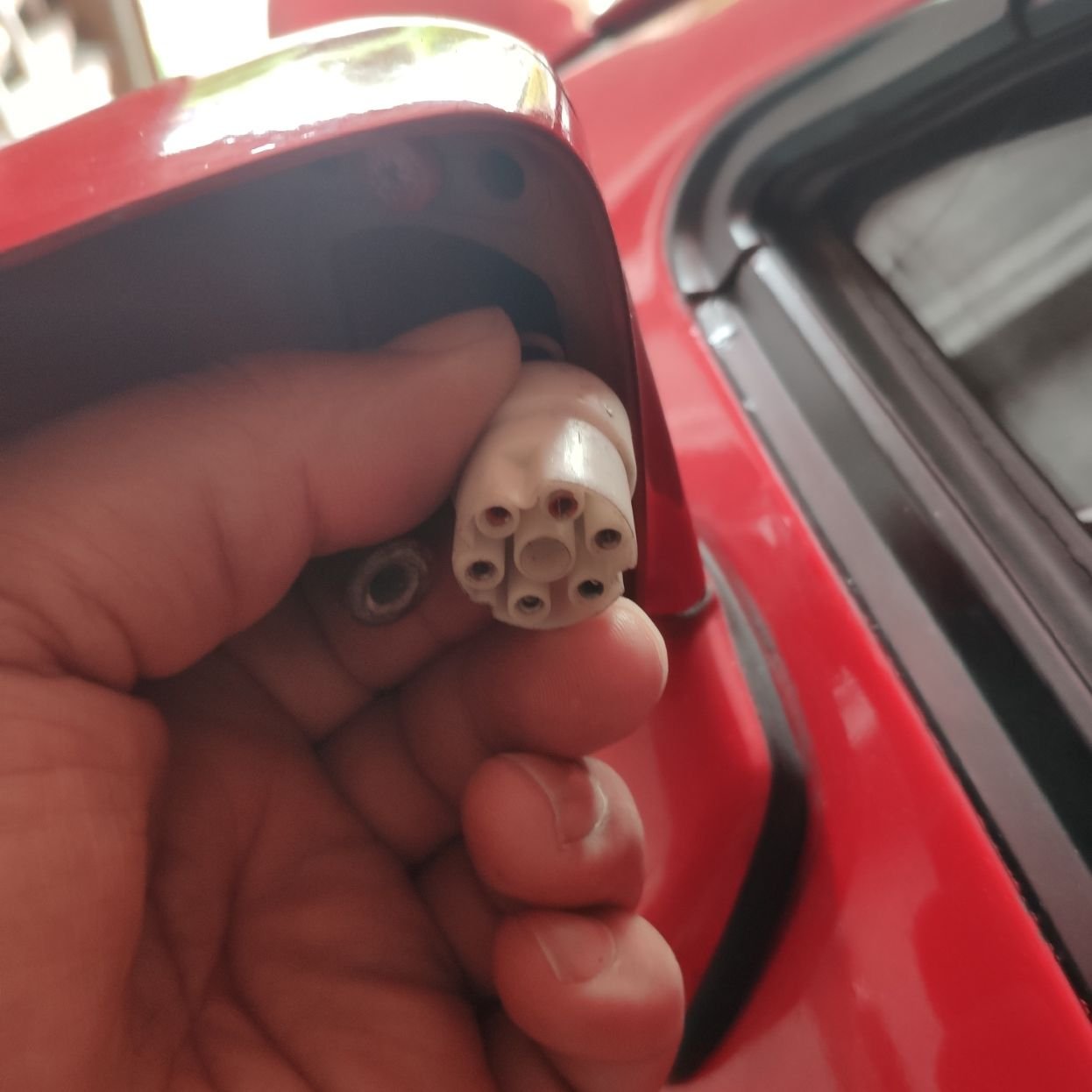 Once these bolts are removed the front of the mirror housing comes away and you will see a barrel connector that allows you to easily disconnect the front of the mirror. Once this is placed aside you can see that the side of the barrel connector still attached to the car is too large to fit through the hole you have in the mirror, and all you have to do is poke the wires out of the barrel connector. I used the end of a pair of needle nose pliers to do it, or you can get a cheap set of "keys" off Amazon/eBay if you search using terms like "Auto Terminals Removal Key Tool Car Pin Extractor", as these only cost around £5.