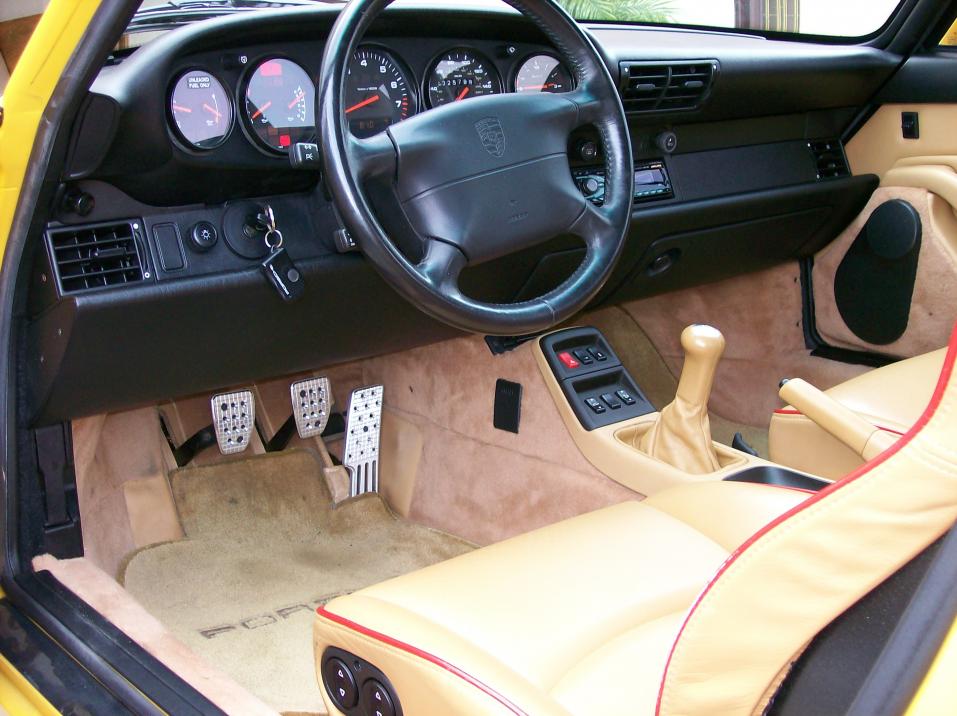 I am the 2nd owner of this beautiful 1995 911 porsche C4 low miles car it has the rare color speed yellow and tan inside with red accents throw out that are done very well and look factory, I have owned it for most of its life never in rain/snow/or night time driving/ or never washed with water, water has never touched this car it is garaged 24/7 365 days a year, car is lowered 1 1/2, exhaust system, custom wing in rear and on bottom of front bumper, custom alum pedals, custom porsche decals on front fenders NOT CHEAP ones they set off the car real nice, custom radar installed like I said above all these thing that are done to the car look factory, custom sound system alpine head unit and custom speaker box made in the back to replace the rear seats, 18inch custom fikse rims, front air vents to cool down the brakes,carbon fiber rocker cover on bottom of inside door jam that say Carrera, that car is a 6speed with 26,000miles, I have the title in hand, this car has every opts and more, everything on this car is factory nothing has been changed or touched on the car including the drive train the only thing that are after market are the things that were custom added, I'm sure I'm forgetting something, i have most of the oig. parts but the rims/backseats